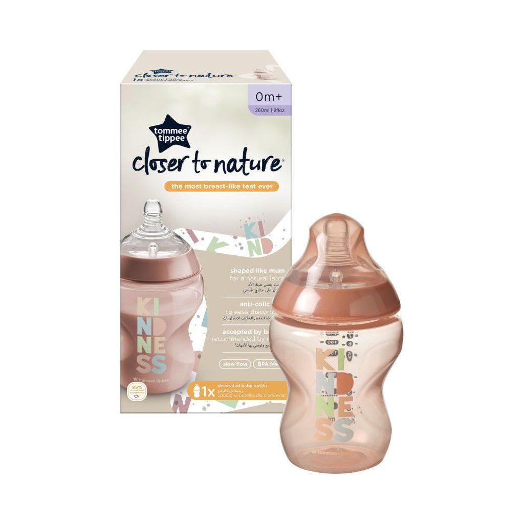 Kojenecká lahvička Tommee Tippee Closer To Nature s unikátní silikonovou savičkou, která svým tvarem a vlastnostmi připomíná mateřský prs. Teplou tekutinou uvnitř lahvičky se savička zahřeje na příjemnou teplotu, měkký a pružný konec savičky připomíná mateřskou bradavku. Dítě tak téměř nepociťuje rozdíl mezi kojením a krmením z této lahvičky. Lahvička je antikoliková, opatřená malým ventilačním otvorem na okraji savičky, který citlivě zabezpečí únik vzduchu z láhve, tím umožní plynulé sání tekutiny a zároveň snižuje riziko břišní koliky. Neobsahuje Bisfenol A.