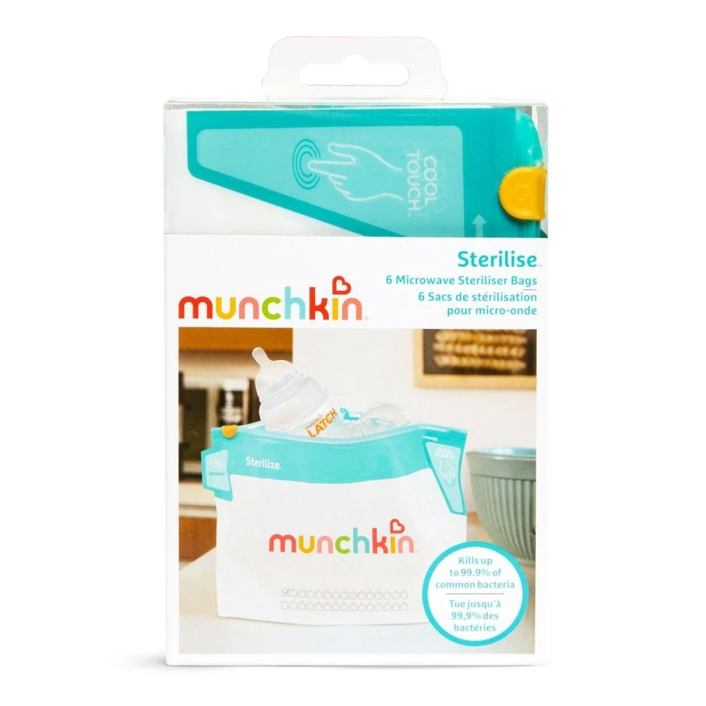 Munchkin uzavíratelné sterilizační sáčky do mikrovlnky umožňují odstranit 99,9 % bakterií z dětských lahví, dudlíků, kousátek, hraček a dalších příslušenství kdykoli a kdekoli. Používají se jednoduše s mikrovlnnou troubou a vodou. Sáčky jsou dobře uzavíratelné na zip a opakovaně použitelné až 30× – počet použití si můžete zaznamenat na počítadle na sáčku. Pro bezpečné použití mají rukověť Cool-Touch a otvor pro únik páry a vylištění zbylé vody. Kompaktní, přenosné a ideální pro domácí i cestovní použití. Pouze pro mikrovlnné trouby 500–1000 W.Doplňkové parametry