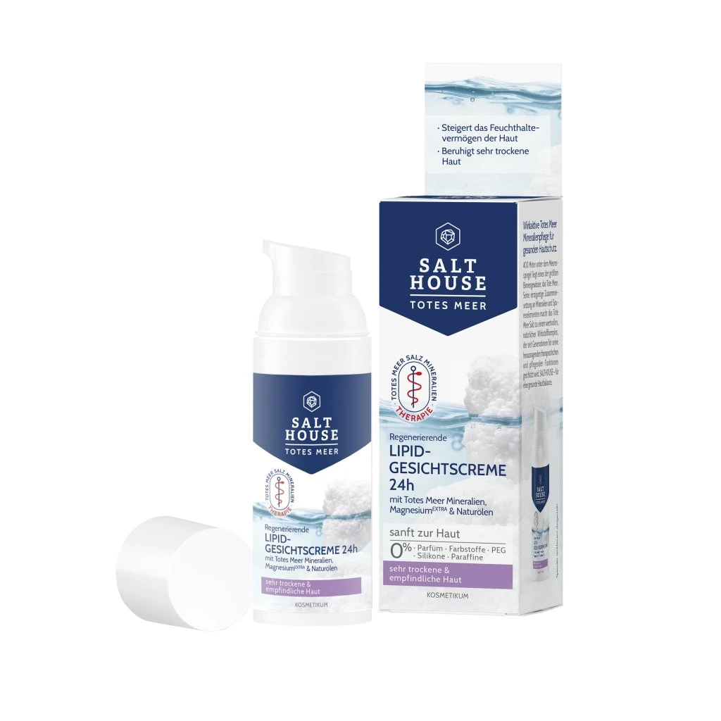 Salthouse pleťový krém s lipidy je vysoce výživný regenerační krém určený pro velmi suchou, podrážděnou až zralou pleť. Obsahuje cenné minerály z Mrtvého moře a koncentrát omega mastných kyselin z přírodních olejů, které posilují lipidovou bariéru pokožky a dlouhodobě zabraňují ztrátě vlhkosti. Kombinace bambuckého másla, panthenolu a vitamínu E podporuje obnovu buněk, zlepšuje pružnost a zmírňuje jak podráždění, tak pocit napětí. Díky bohaté textuře je krém vhodný i jako noční maska pro intenzivní péči. Hlavní benefity: Hloubková hydratace – dlouhodobé zadržování vlhkosti díky minerálům a lipidům Regenerace a zklidnění – bambucké máslo, panthenol a vitamín E posilují strukturu pleti Zjemnění a pružnost – hebká, vláčná pokožka plná vitality Noční péče nebo maska – bohatá textura pro okamžitou výživu pleti Vlastnosti: Bez minerálních olejů, parafínu, parfemace, PEG, silikonů i SLS pH-vyvážený, dermatologicky testovaný Vhodný i při kožních obtížích, jako je neurodermatitida nebo psoriáza Objem: 50 ml Použití: Ráno a večer aplikujte na vyčištěnou pokožku obličeje a jemně vmasírujte. Tip: pro extra dávku výživy můžete použít krém jako noční masku.Doplňkové parametry