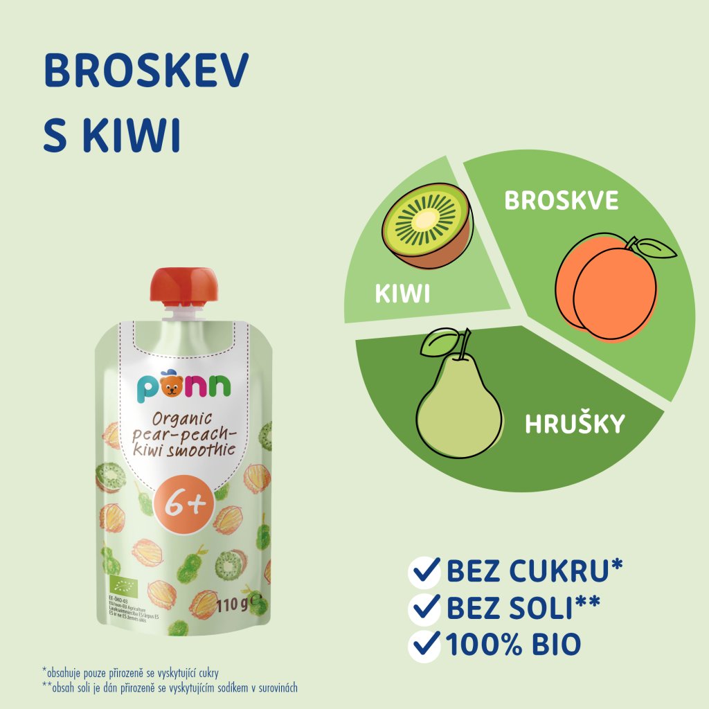 Broskev, hruška a kiwi! Tato kombinace je zárukou, že kapsička díky šetrnému zpracování obsahuje spoustu přirozeně prospěšných látek. Broskve mají pozitivní vliv na trávení a hrušky napomáhají odstraňovat zažívací potíže, zejména zácpu. Dětem ale nabízí především variaci skvělých chutí, v kterých se díky jednoduchému složení rozhodně neztratí!
