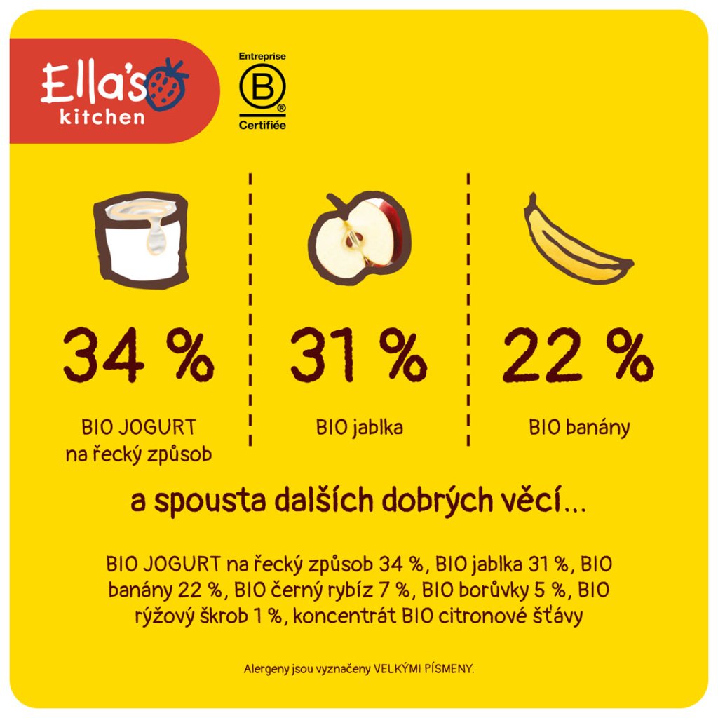 Výrobce: Ella’s Kitchen Ella’s Barn, 22 Greys Green Farm Rotherfield Greys Henley-on-Thames RG9 4QG, Velká Británie. Oficiální distributor: Health Academy, s. r. o., Zbraslavská 22/49, 159 00, Praha, Česká republika.
