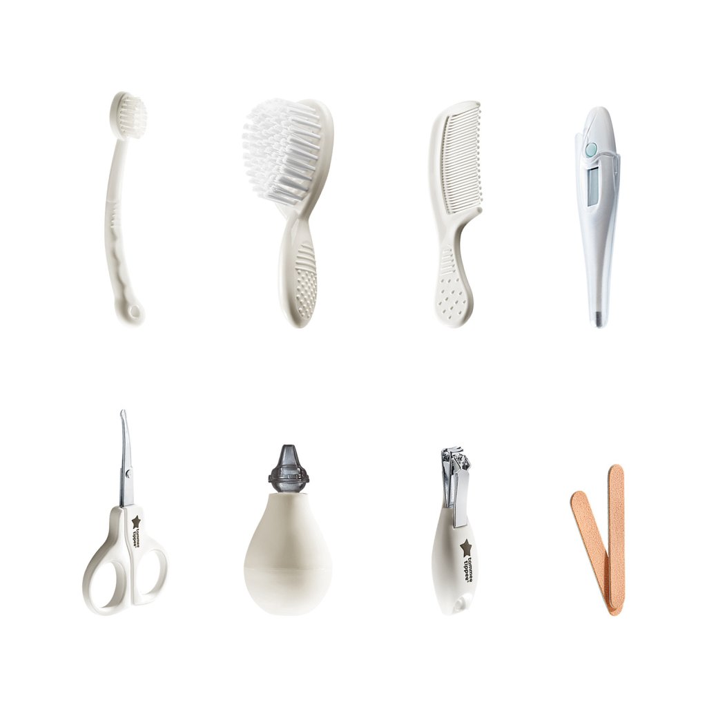 Tato sada pomůcek v praktickém balení vám pomůže při péči o miminko na cestách i doma. Obsahuje digitální ústní teploměr, odsávačku hlenů, zubní kartáček, kartáč, hřeben, nůžky kleštičky na nehty a dva pilníčky na nehty. Devět základních pomůcek tak budete mít vždy po ruce a navíc úhledně uspořádaných v praktické taštičce.