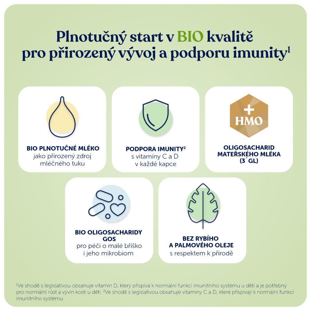 BIO plnotučné MLÉKO (147 g tekutého MLÉKA na 100 g prášku), BIO syrovátková bílkovina (z MLÉKA), BIO laktóza (z MLÉKA), BIO rostlinné oleje (slunečnicový, kokosový, řepkový), BIO galaktooligosacharidy (z MLÉKA), BIO smetana (z MLÉKA), citronan sodný, emulgátor: BIO slunečnicový lecitin, chlorid draselný, fosforečnan draselný, olej z mikrořas Schizochytrium sp., cholin bitartrát, fosforečnan vápenatý, citrát vápenatý, olej z Mortierella alpina, uhličitan vápenatý, Nukleotidy (cytidin-5´-monofosfát, sodná sůl uridin-5´- mono-fosfátu, adenosin-5´-monofosfát, sodná sůl inosin -5′-monofosfátu, sodná sůl guanosin-5′-monofosfátu), vitamin C, chlorid hořečnatý, taurin, pyrofosfát železitý, inositol, vitamin E, síran zinečnatý, niacin, kyselina pantothenová, vitamin D3, seleničitan sodný, vitamin A, biotin, síran měďnatý, vitamin K, thiamin, jodid draselný, hydroxid vápenatý, kyselina listová, vitamin B12, vitamin B6, síran manganatý, regulátor kyselosti: kyselina citronová.