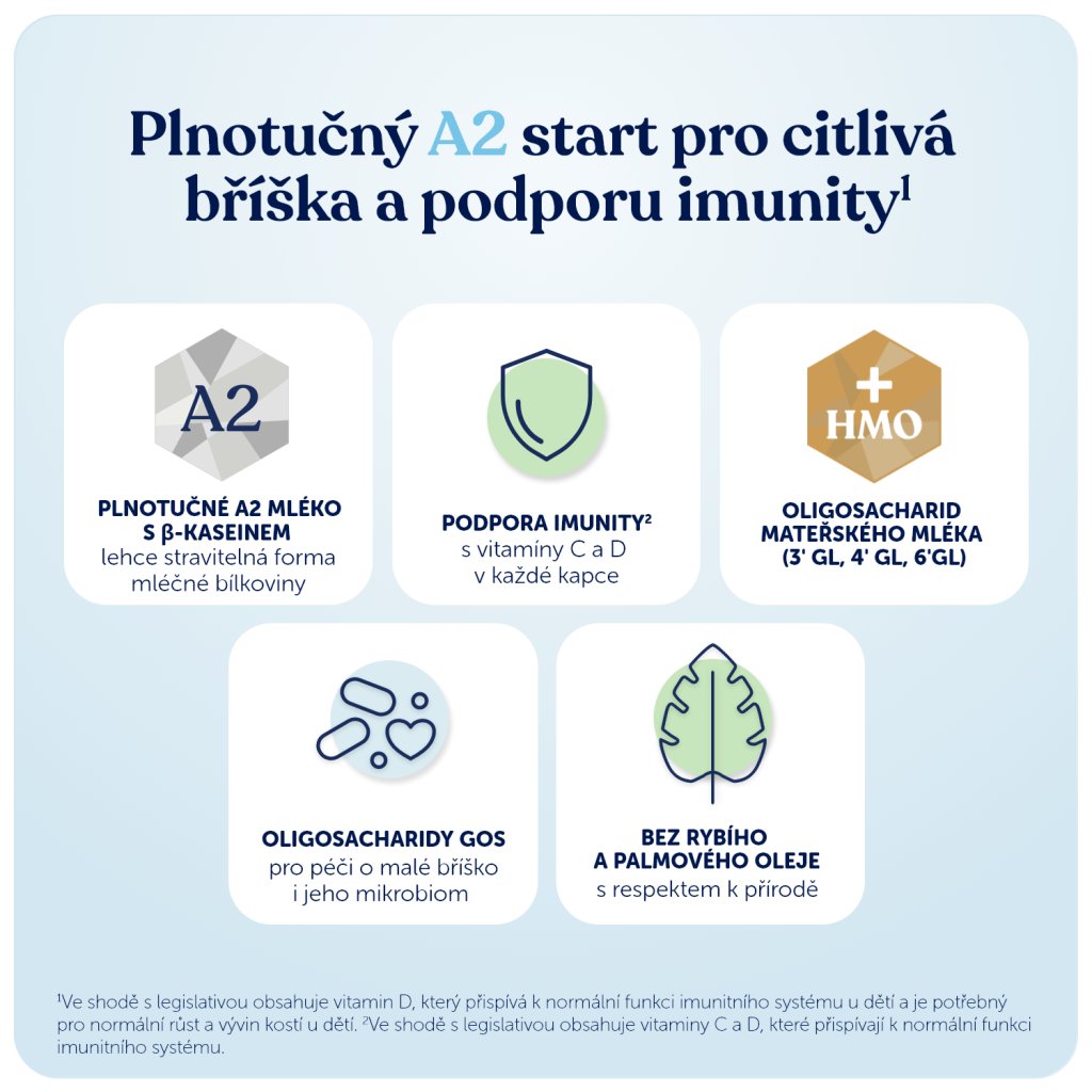 1 Obsahuje DHA (jak požadují právní předpisy pro veškerou kojeneckou výživu. DHA (neboli kyselina dokosahexaenová) je polynenasycenou mastnou kyselinu s dlouhým řetězcem, která patří mezi omega-3 mastné kyseliny, která je produkována mikrořasami a nalezneme ji také u všech zvířat, které se těmito řasami živí. Omega 3 patří k esenciálním mastným kyselinám, které si tělo samo nedokáže vyrobit a je tak odkázáno na vnější příjem (většinou stravou).