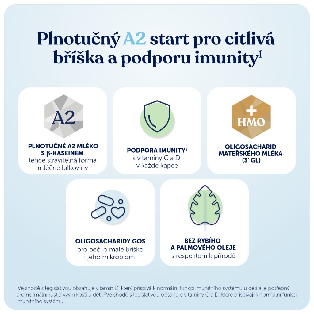 1 Obsahuje DHA (jak požadují právní předpisy pro veškerou kojeneckou výživu. DHA (neboli kyselina dokosahexaenová) je polynenasycenou mastnou kyselinu s dlouhým řetězcem, která patří mezi omega-3 mastné kyseliny, která je produkována mikrořasami a nalezneme ji také u všech zvířat, které se těmito řasami živí. Omega 3 patří k esenciálním mastným kyselinám, které si tělo samo nedokáže vyrobit a je tak odkázáno na vnější příjem (většinou stravou).