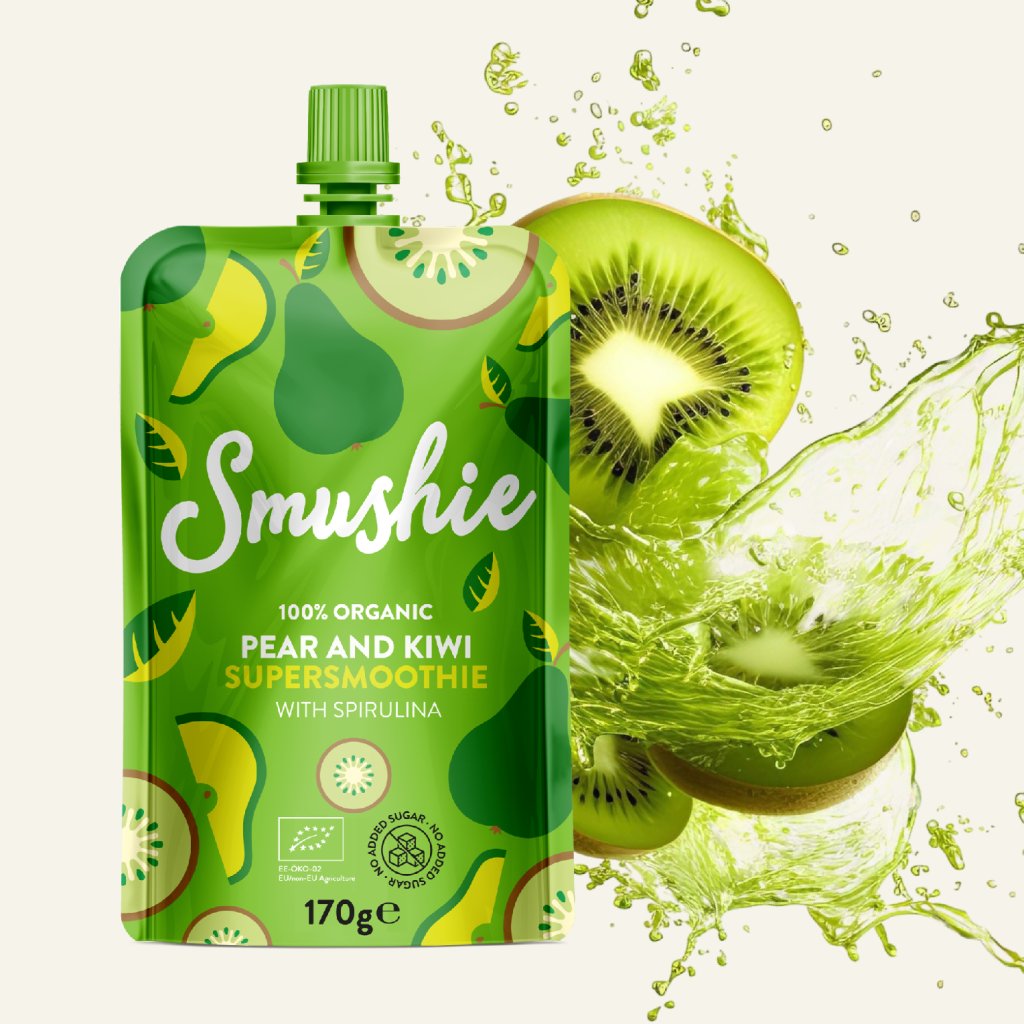 Složení: *hruškové pyré 65 %, *kiwi pyré 20 %, *banánové pyré, *ovesné vločky, *máta, *spirulina 0,04 %. *z ekologického zemědělství.