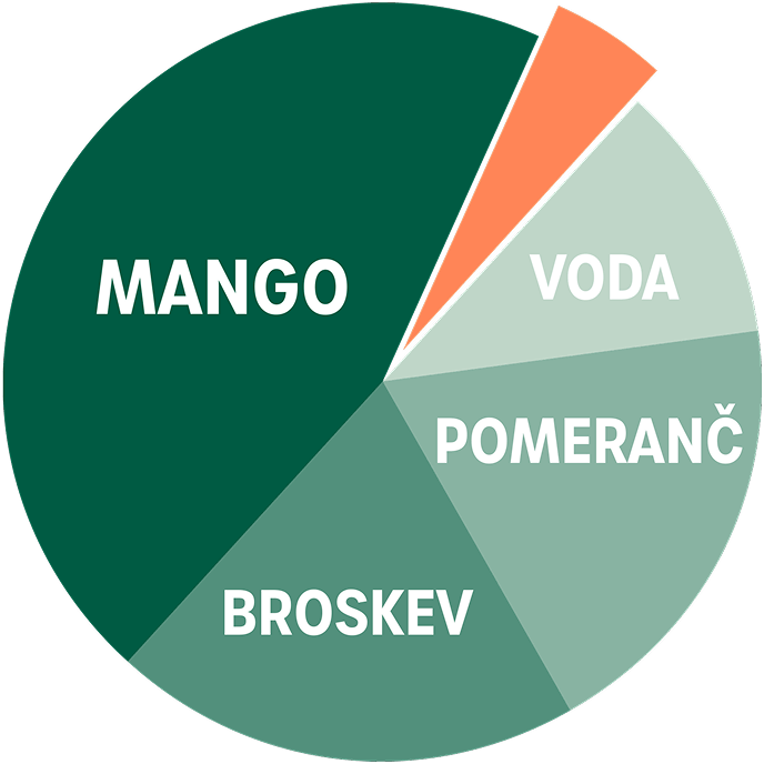Složení: *mangové pyré 45 %, *broskvové pyré, *pomerančová dužina 19 %, voda, *datle 5 %. *z ekologického zemědělství. Může obsahovat stopy datlových pecek.