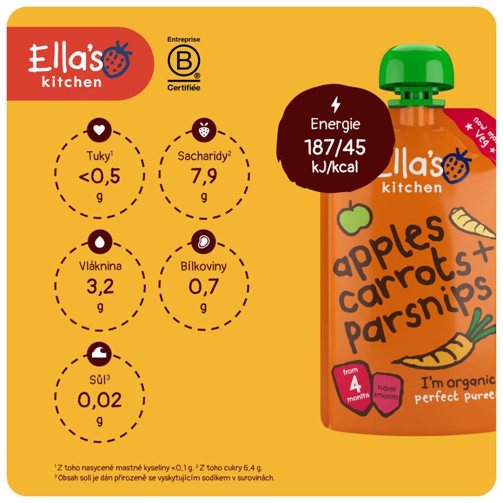 Výrobce: Ella’s Kitchen Ella’s Barn, 22 Greys Green Farm Rotherfield Greys Henley-on-Thames RG9 4QG, Velká Británie. Oficiální distributor: Health Academy, s. r. o., Zbraslavská 22/49, 159 00, Praha, Česká republika.