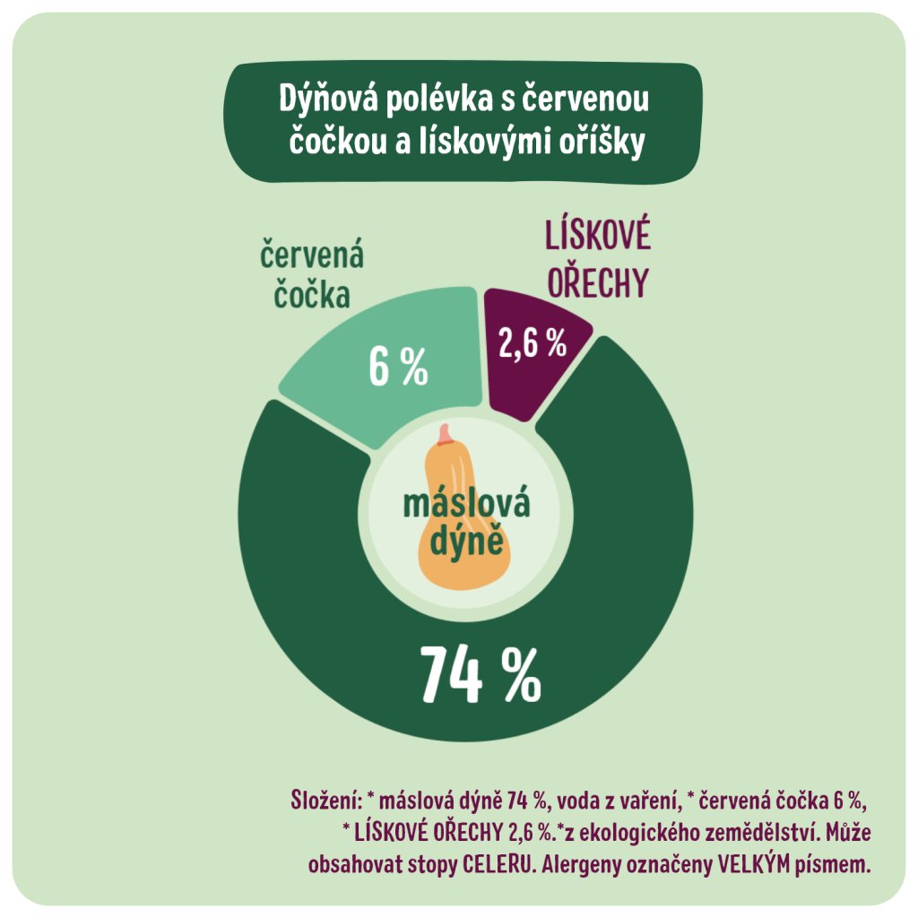 Složení: * máslová dýně 74 %, voda z vaření, * červená čočka 6 %, * LÍSKOVÉ OŘECHY 2,6 %. *z ekologického zemědělství. Může obsahovat stopy CELERU. Alergeny označeny VELKÝM písmem.