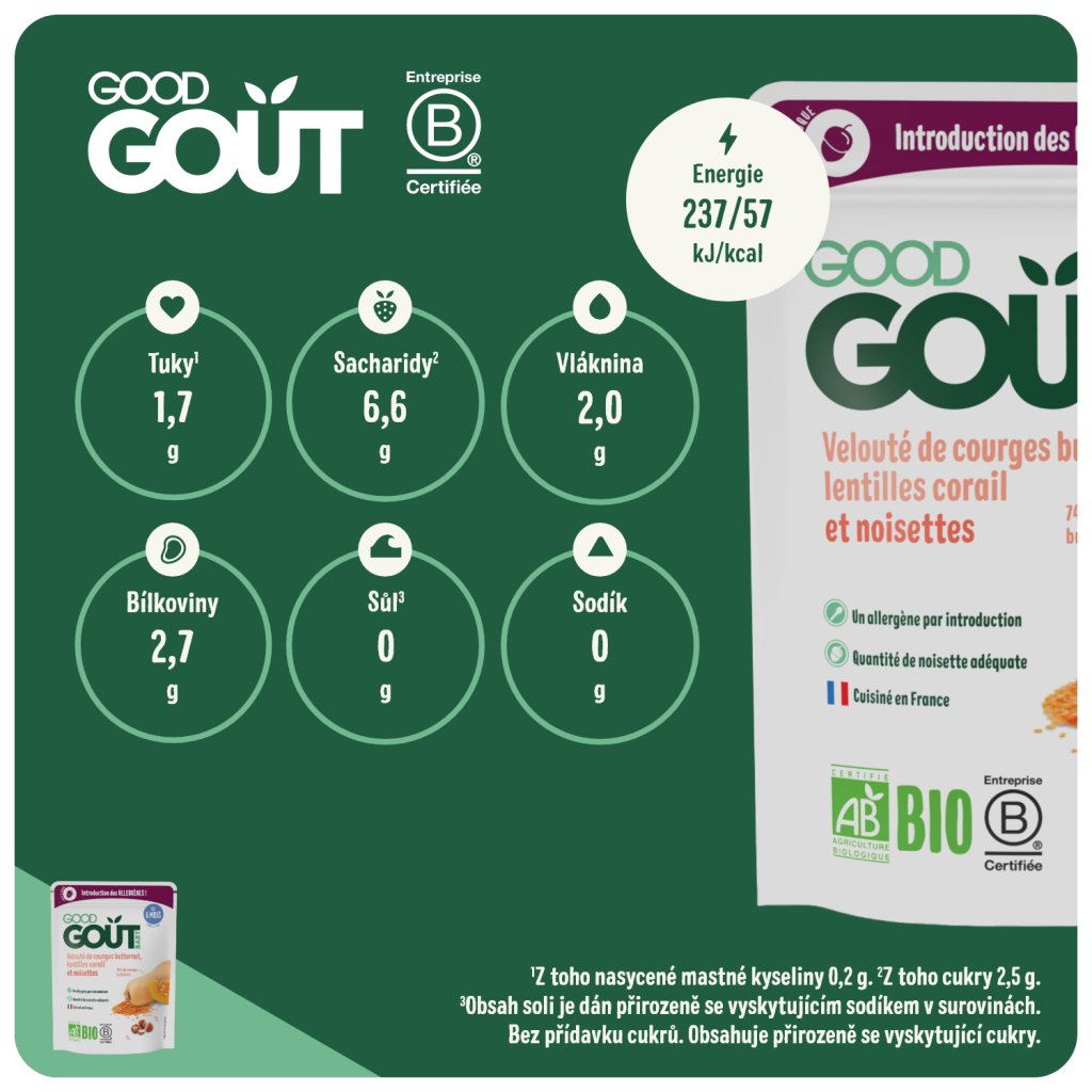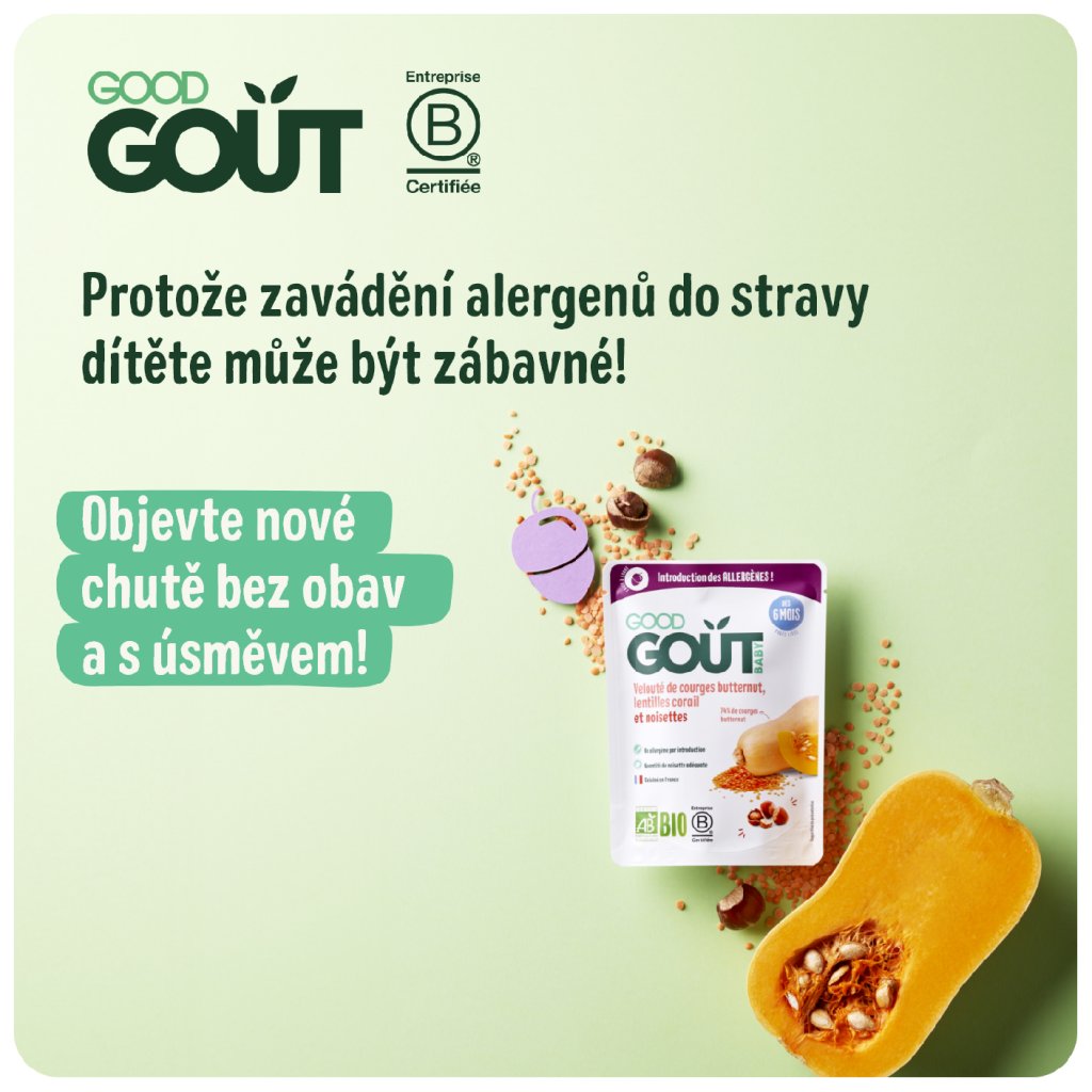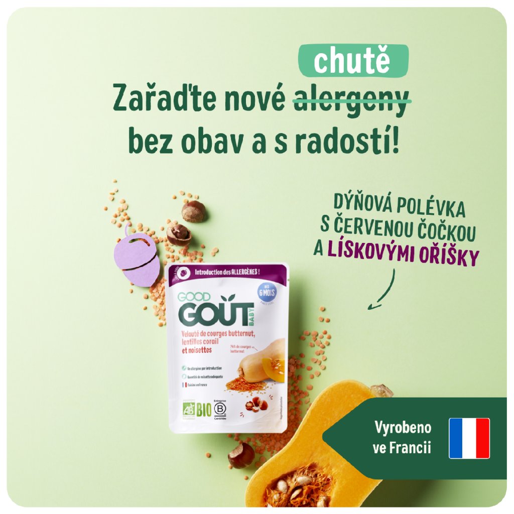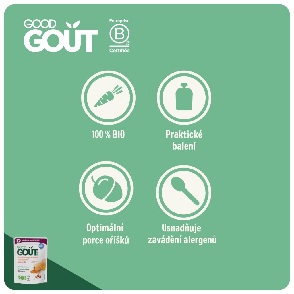 V Good Gout rádi překvapujeme dětské chuťové buňky zajímavými ingrediencemi a tím nejlepším z přírody! S lískou se sice venku běžně setkáváme, ale málokdy objevíte její plody v dětských příkrmech. Proto jsme vymysleli ideální jídlo, které miminku představí nasládlou chuť oblíbených lískových oříšků již od ukončeného 6. měsíce. A vám, rodičům, tím umožníme zavést do stravy miminka další alergen.