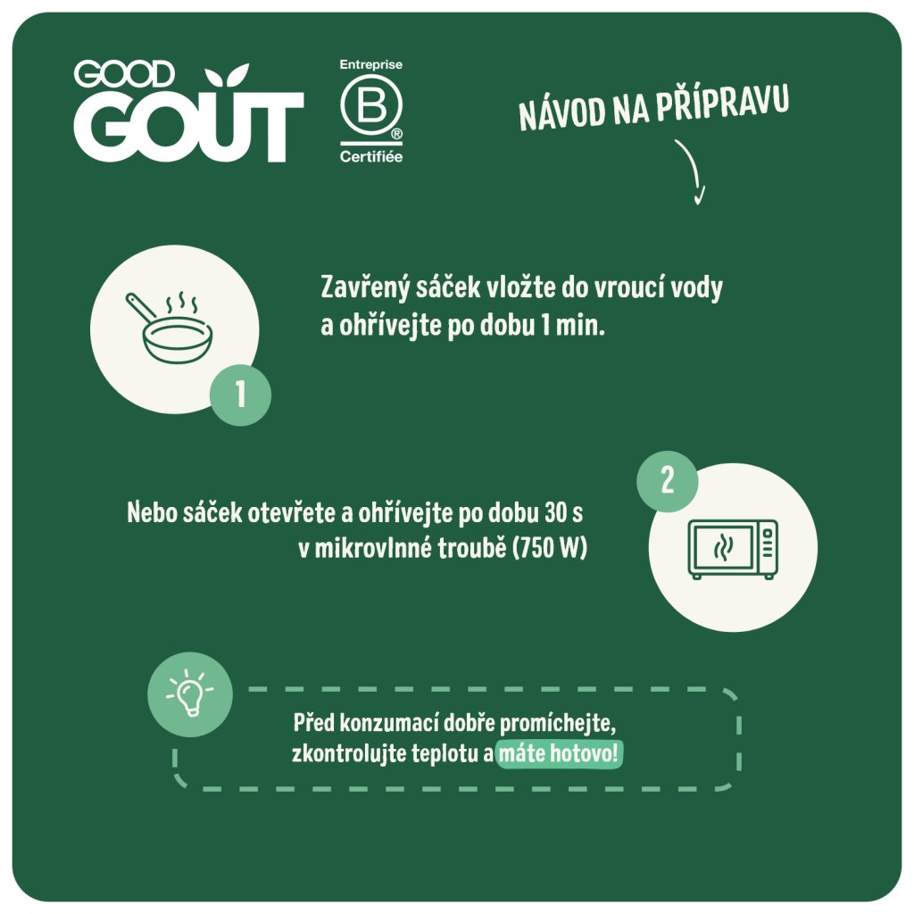 Zavřený sáček vložte do vroucí vody a ohřívejte po dobu 1 min nebo sáček otevřete a ohřívejte po dobu 30 s v mikrovlnné troubě (750 W). Před konzumací dobře promíchejte, zkontrolujte teplotu a máte hotovo!